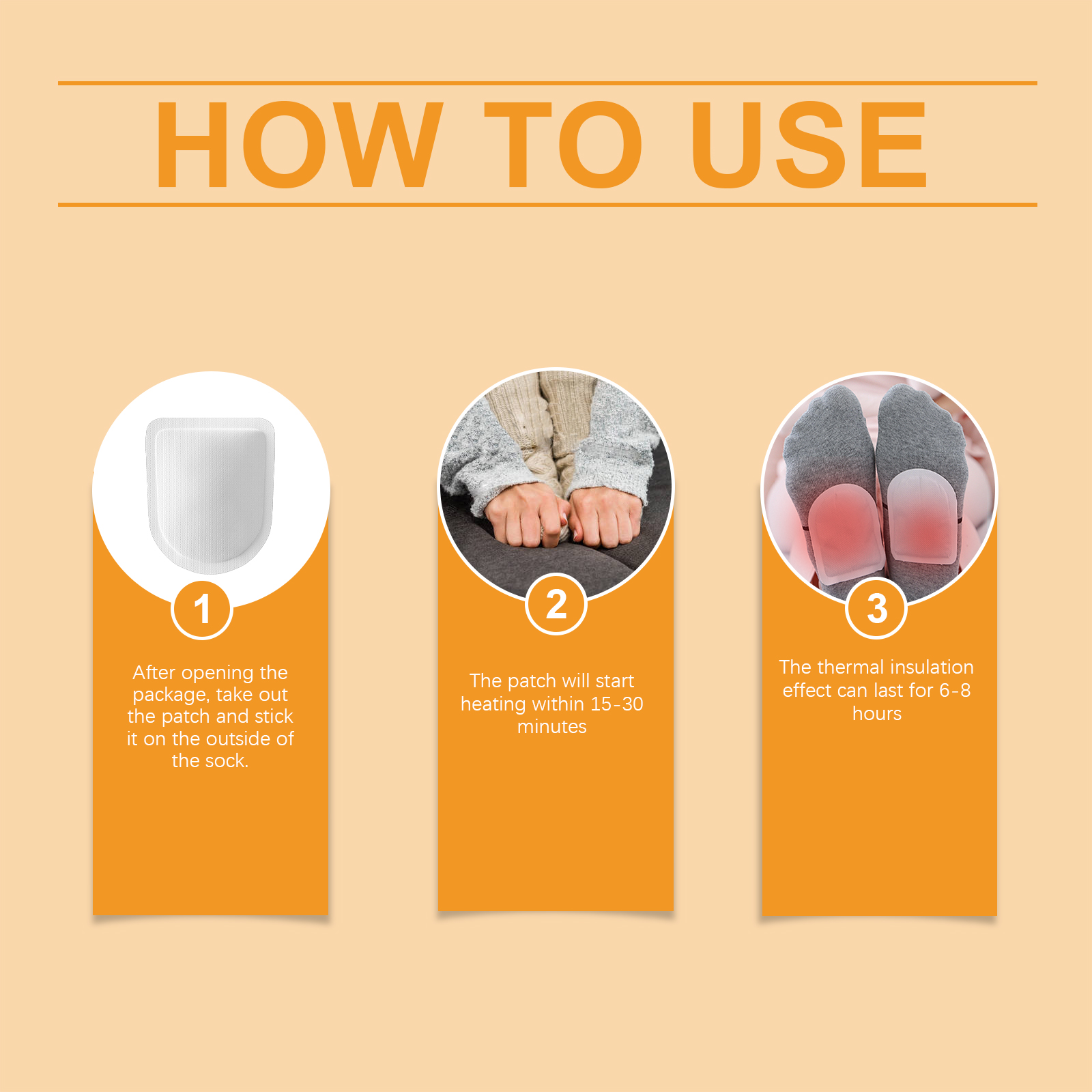我们的便携暖脚宝含有木粉、粘合剂。它可以迅速升温,温暖你的双脚,让你在冬天睡得更安稳。它的使用方法很简单:打开包装后,取出贴片,粘在袜子的外面,贴片将在15-30分钟内开始加热,保温效果可持续6-8小时。并且可以连续加热长达8小时,全天候保暖保心稳定可靠。