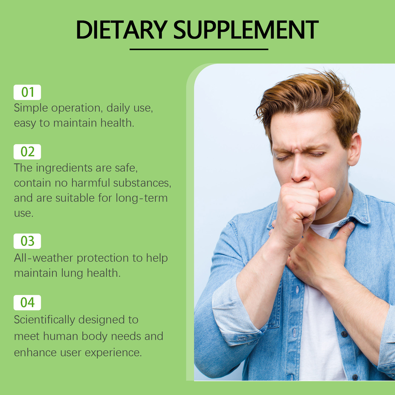 我们的膳食补充剂含有中药提取物,葡萄糖酸内脂,维生素b1。它可以提供天然的肺部保护作用,增强健康。促进营养吸收,增强体质;提供必需的营养,增强免疫力。它的使用方法很简单:食用前请摇匀,每次1-2滴。配方温和,安全无刺激性;科学配方,清洁肺部,保持呼吸顺畅。