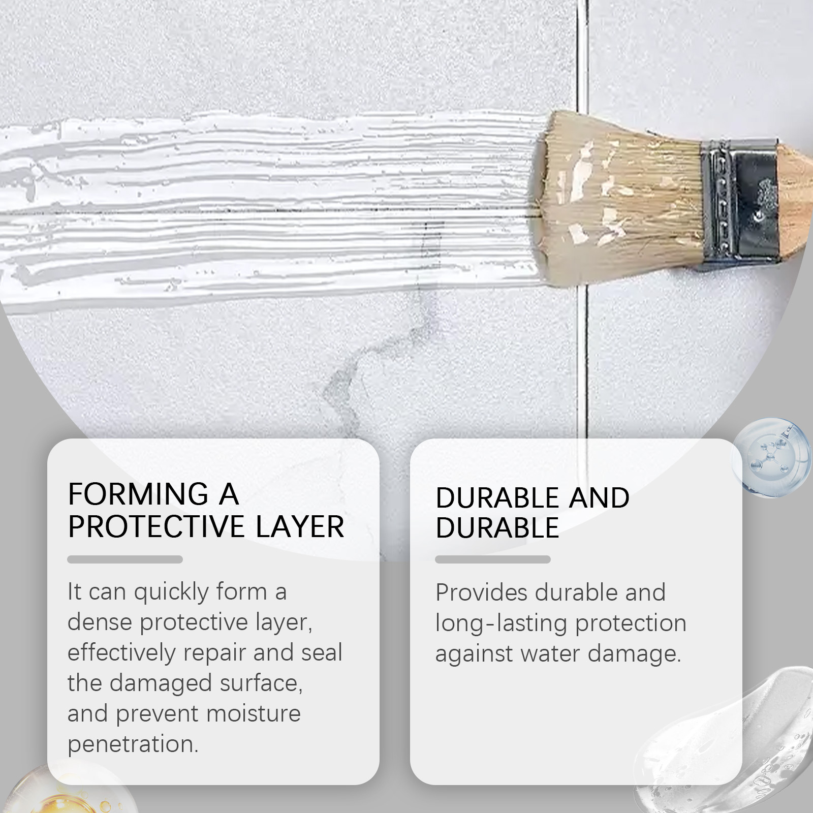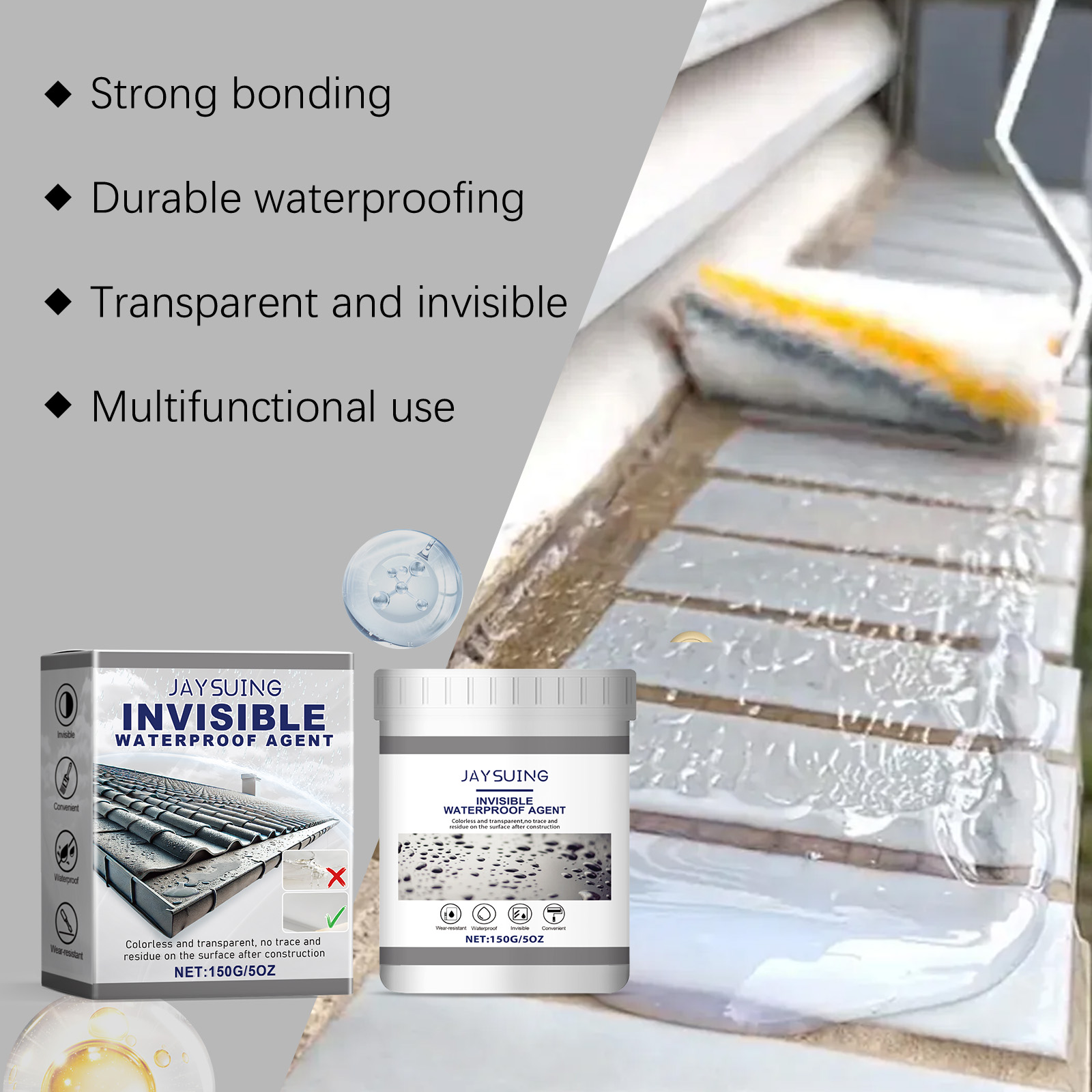 我们的透明防水胶(300g)含有消泡剂、聚氨酯树脂。它可以提供持久和持久的保护,防止水的破坏。它的使用方法很简单:清洁施工表面,确保表面无湿气,用刷子将隐形防水胶均匀地涂抹在施工区域上,等待24小时干燥。并且可以迅速形成致密的保护层,有效修复和封闭受损表面,防止水分渗透。