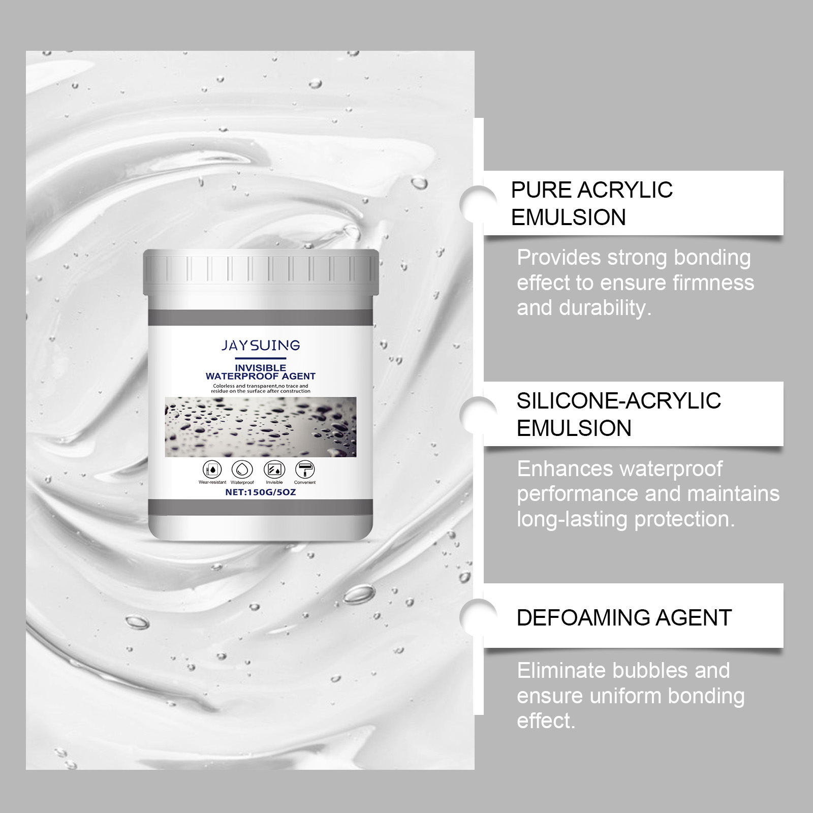 | 成分 | 硅丙乳液、消泡剂、聚氨酯树脂 |