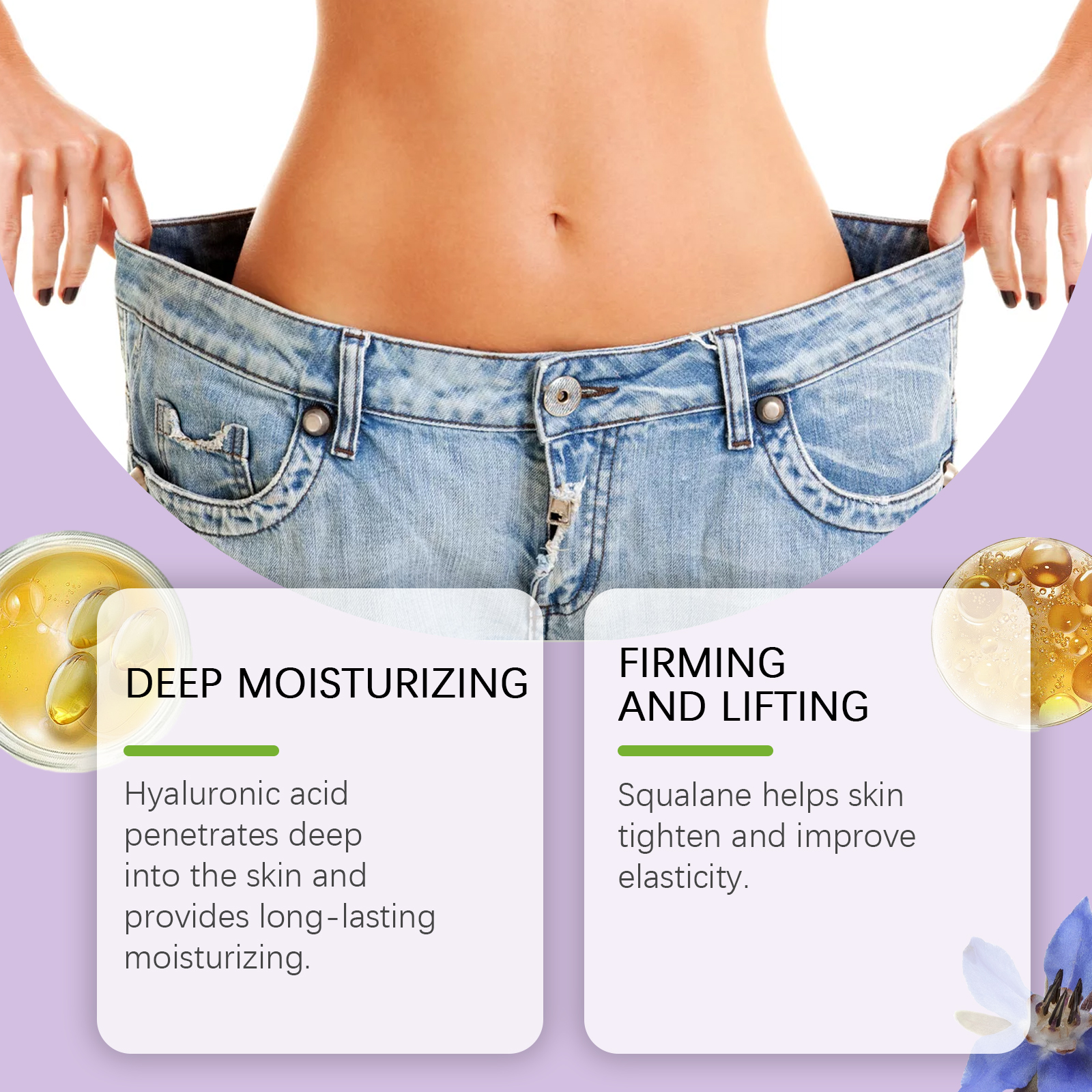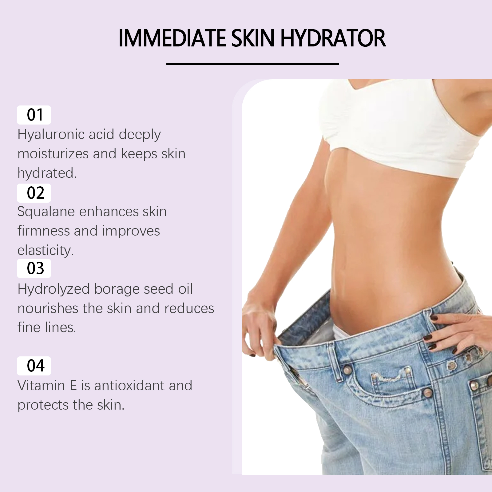 我们的透明质酸身体护理霜含有透明质酸、角鲨烷、生育酚(维生素E)。它可以水解琉璃苣籽油减少细纹,使皮肤光滑。质地轻盈,吸收快,舒适不油腻。透明质酸能深入皮肤,持久保湿。它的使用方法很简单:1.清洁身体皮肤,保持干燥;2.取适量本品均匀涂抹于颈部、腿,腹部,手臂或任何你想要涂抹的部位;3.轻轻按摩直至完全吸收。透明质酸能深入皮肤,提供持久的保湿。角鲨烷有助于紧致皮肤,提高弹性。