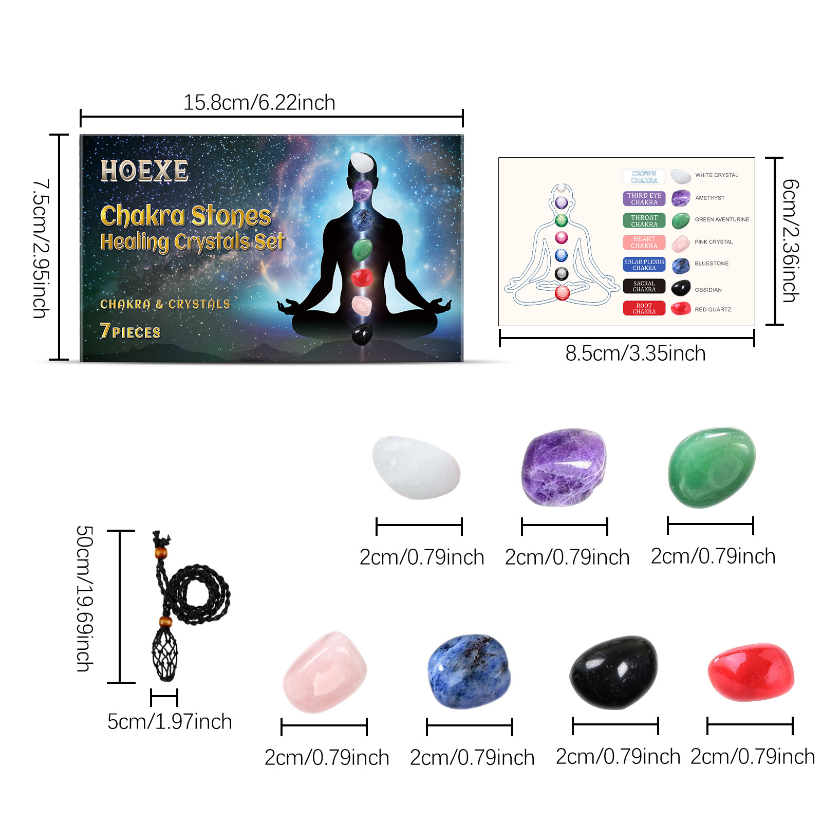 | 产品尺寸 | 粉水晶:2cm,紫水晶石:2cm,红水晶:2cm,蓝纹石:2cm,黑曜石:2cm,白水晶:2cm,男绿东陵石:2cm,说明书:8.5*6cm吊坠:5*50厘米 |