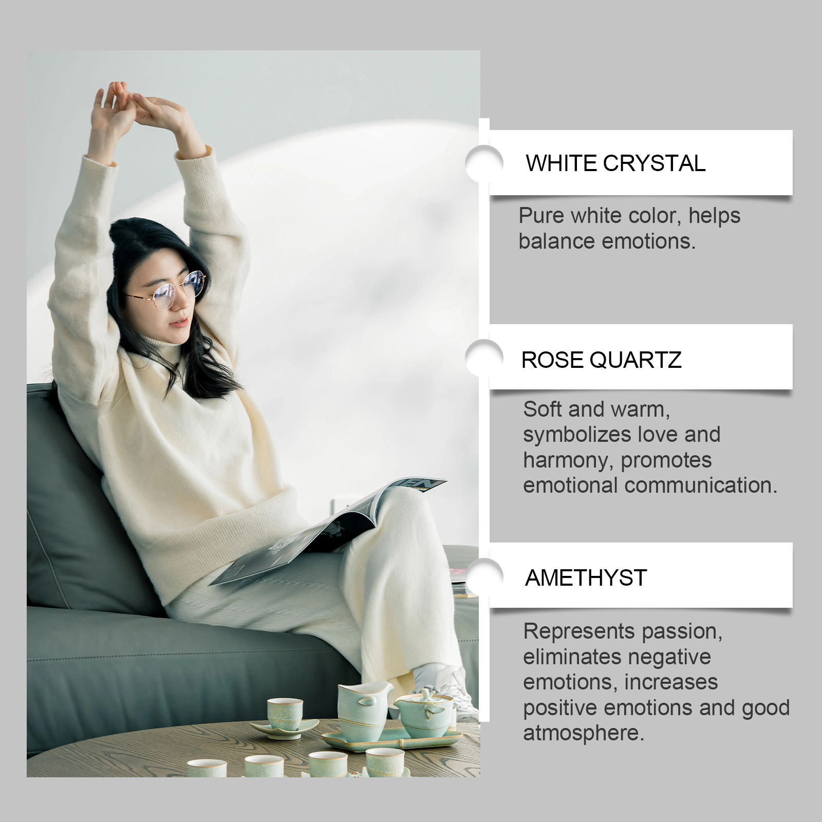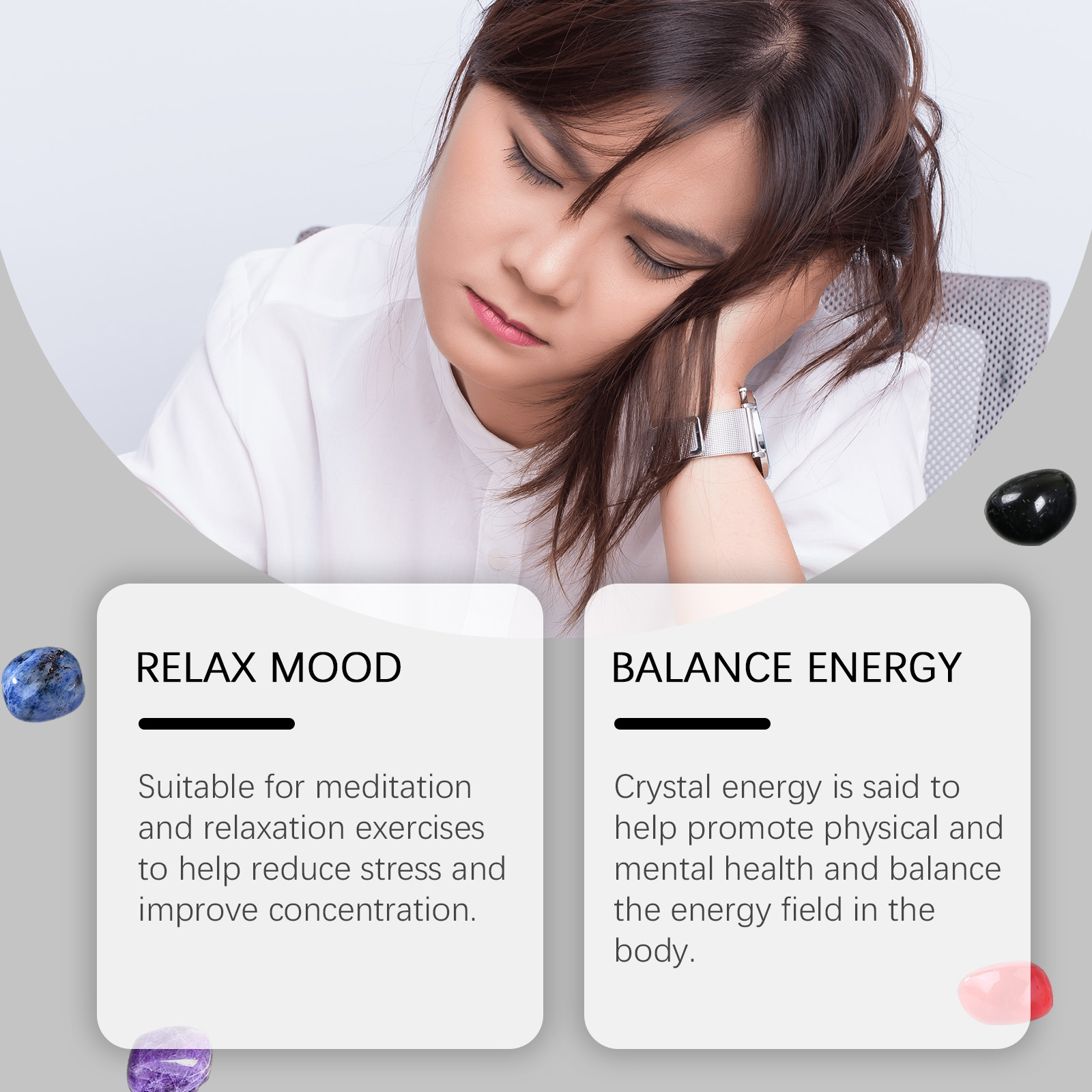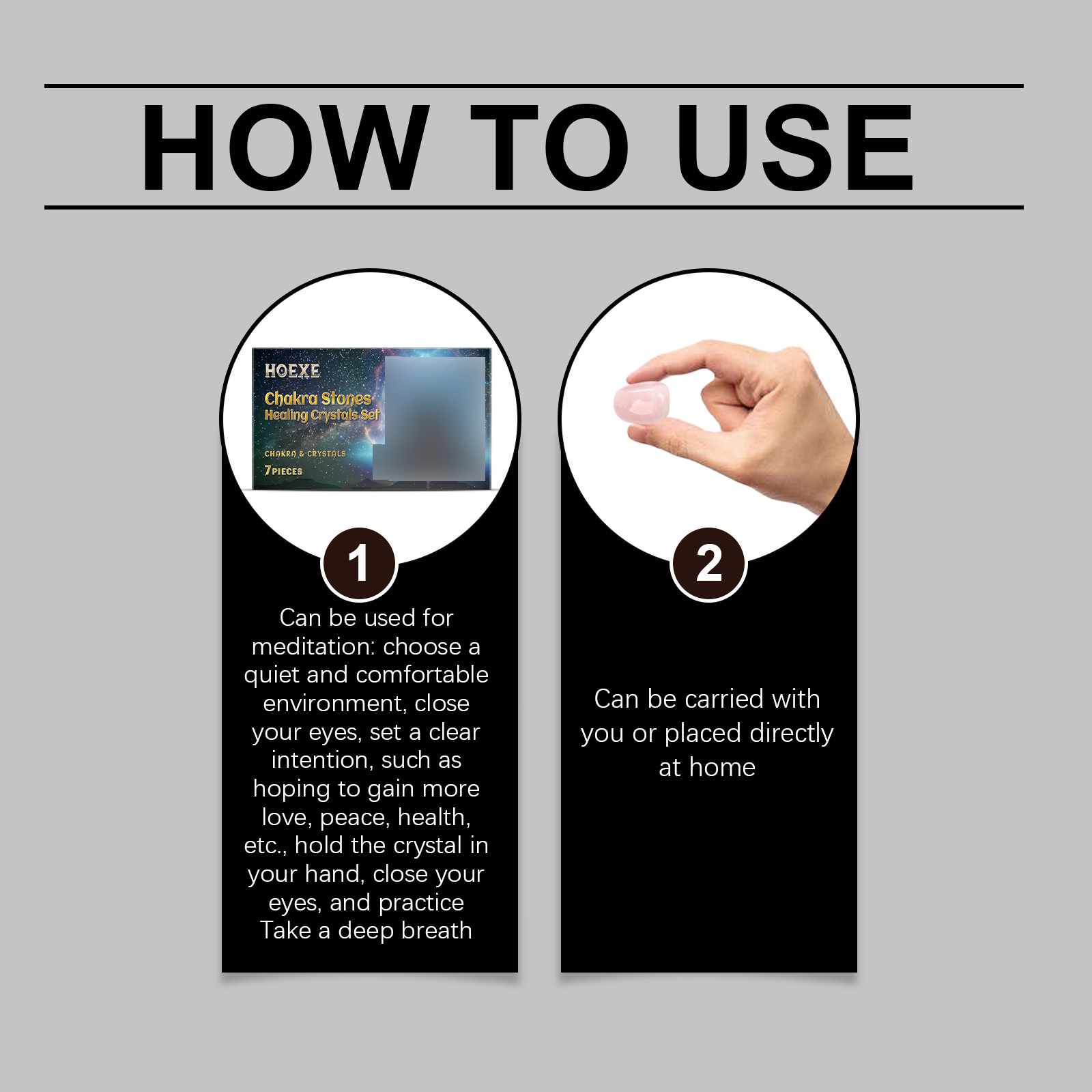 我们的水晶石套装,由粉水晶、紫水晶石精心调配而成。专为促进身心健康,平衡体内的能量场设计。使用方法极为便捷:选择一个安静舒适的环境,闭上眼睛,设定一个明确的意图,例如希望获得更多的爱、和平、健康等,将水晶握在手中,闭上眼睛,练习深呼吸,可随身携带或直接放置在家中。并且可以冥想和放松练习,有助于减轻压力,提高注意力。