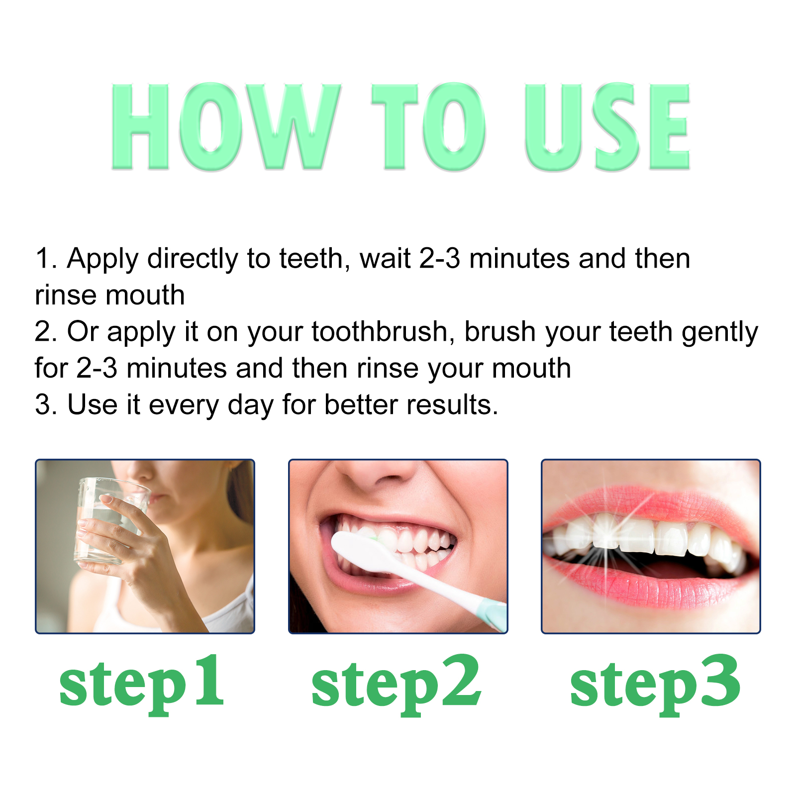 我们的焕白精华液含有小苏打、木糖醇、柠檬提取物。它可以帮助去除牙齿表面的污渍,而不会造成任何损伤。此外,它不仅能美白牙齿,还能强化牙釉质,促进牙齿和牙龈健康,清新口气,防止日后牙齿变色。它的使用方法很简单:一是直接涂在牙齿上,等待2一3分钟后再漱口即可,二是涂在牙刷上,轻轻刷牙2一3分钟后漱口即可,每天使用可以达到最佳效果。可以有效去除牙齿污渍,保持口腔健康,消除口腔异味,还您最好的笑容。