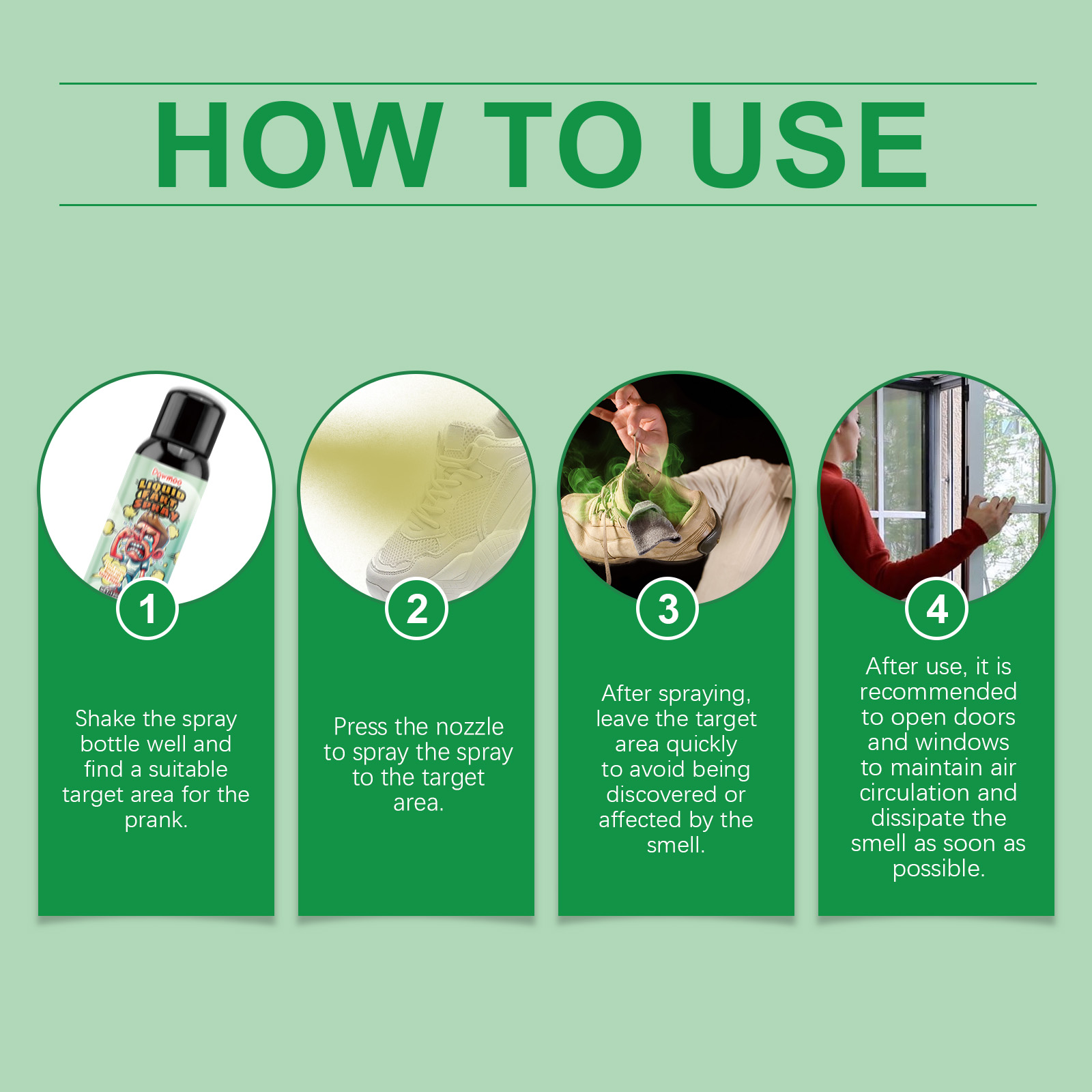 我们的恶作剧臭屁喷雾含有甘油、洋葱鳞茎提取物。它可以模拟真实的气味,效果逼真,让人捧腹大笑。它的使用方法很简单:把喷雾瓶摇匀,找一个合适的恶作剧目标区域。按下喷嘴将喷雾喷射到目标区域,喷酒后,要迅速离开目标区域,以免被发现或受到气味的影响,使用后,建议打保持空开门窗,气流通,尽快消散异味。并且可以采用洋葱提取物、大蒜提取物等天然植物成分,安全、环保,对人体无害。